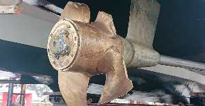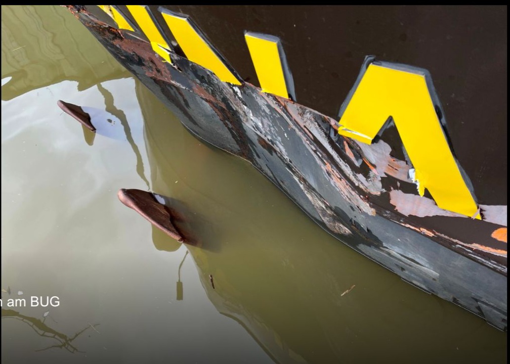 für die Eisfahrt verstärkte Wulstbug des Frachters ein Schadensbild